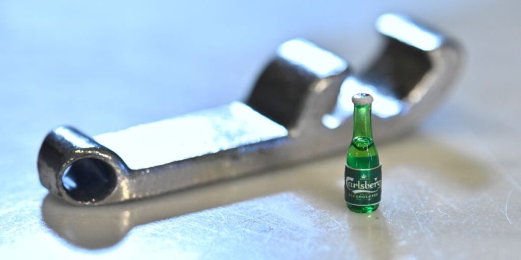 Världens minsta öl – skapad av Carlsberg som en ”alkoholfri symbol för måttfullhet”. Kanske även en symbol för att öldrickandet minskar? (Foto: Claudio Bresciani/TT)